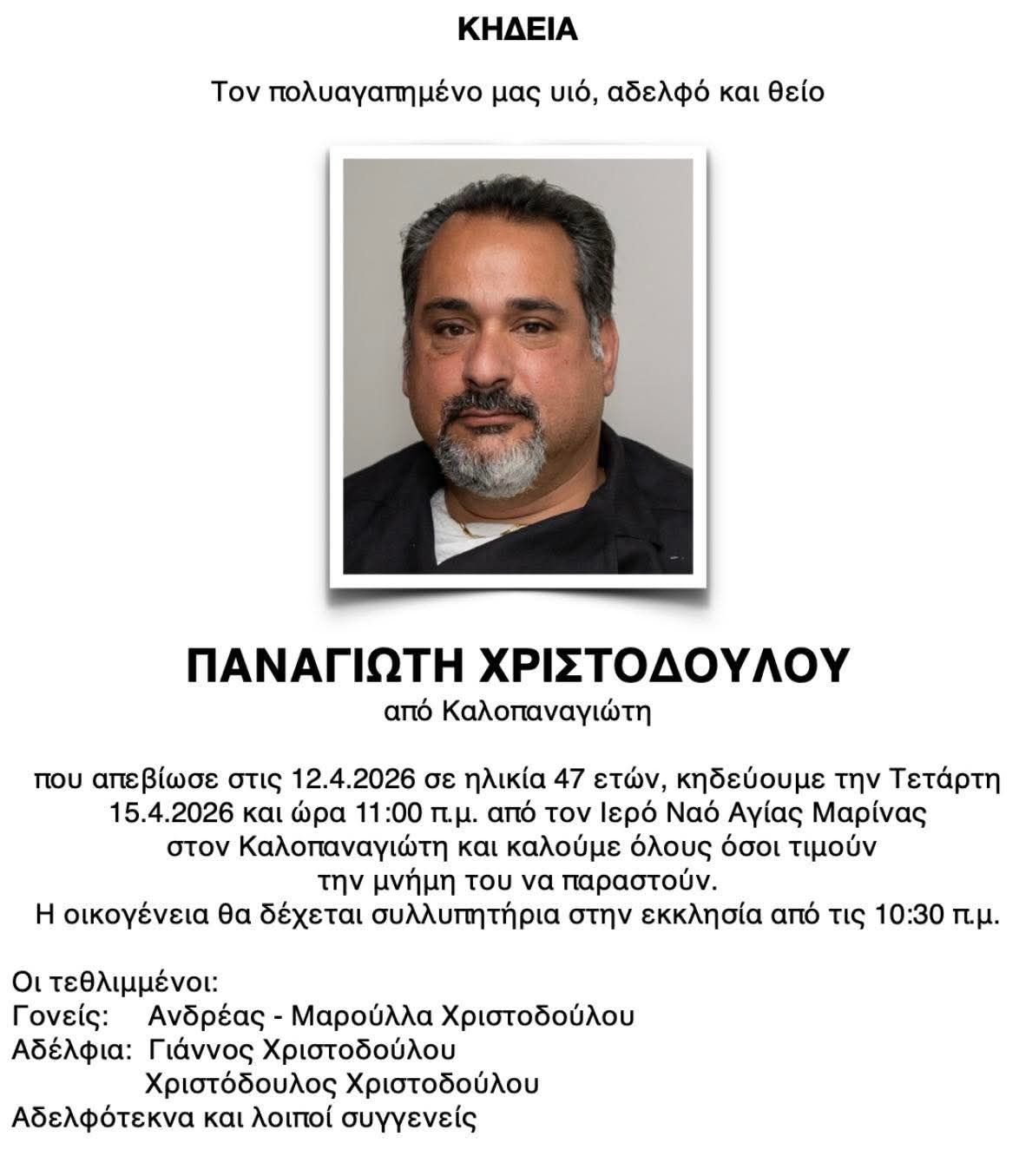Θλίψη στον Καλοπαναγιώτη για τον πρόωρο χαμό του 47χρονου Παναγιώτη Χριστοδούλου