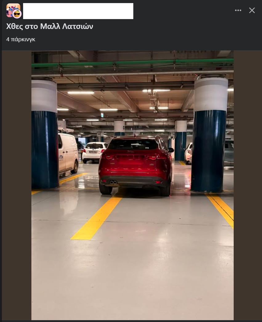 Ένα ασυνήθιστο περιστατικό σημειώθηκε στο εμπορικό κέντρο των Λατσιών στην Κύπρο, όταν οδηγός στάθμευσε το όχημά του καταλαμβάνοντας όχι μία, αλλά τέσσερις θέσεις στάθμευσης.