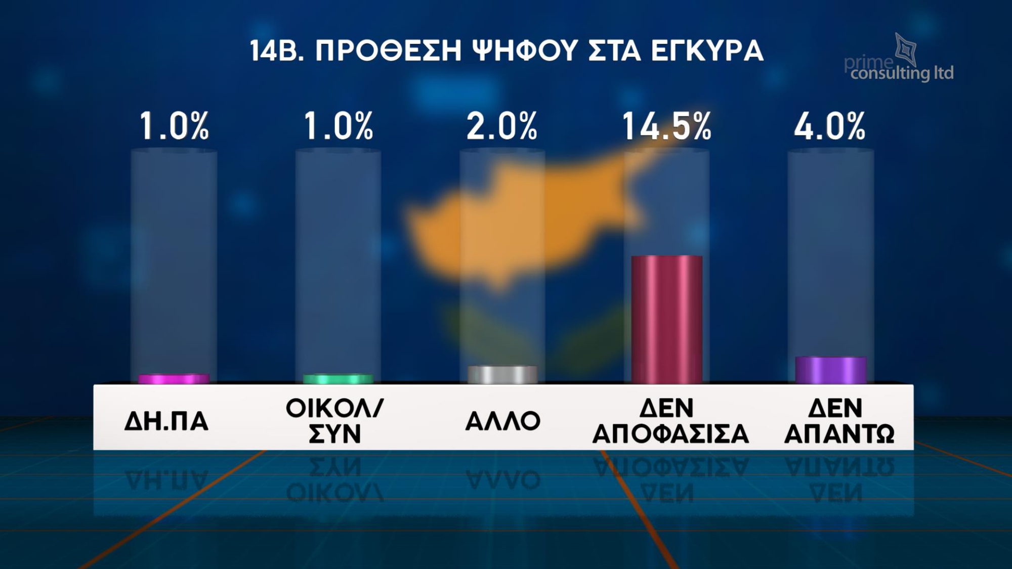 Ίδια εικόνα και στην πρόθεση ψήφου με βάση τα έγκυρα ψηφοδέλτια με τους αναποφάσιστους να φθάνουν το 14,5%. Με βάση πάντως τα αποτελέσματα του 2021 το 30% των αναποφάσιστων ψήφισαν ΔΗΣΥ και το 12% τήρησαν αποχή. Φυσικά, πρέπει να λάβουμε υπόψιν ότι το 2021 δεν είχαμε ούτε ΑΛΜΑ, ούτε Άμεση Δημοκρατία ούτε VOLT ούτε Σήκου Πάνου και ας μη ξεχνάμε τους Οικολόγους οι οποίου έχουν κάνει συνεργασία με το Κόμμα για τα Ζώα Κύπρου και άλλους χώρους/πρόσωπα.