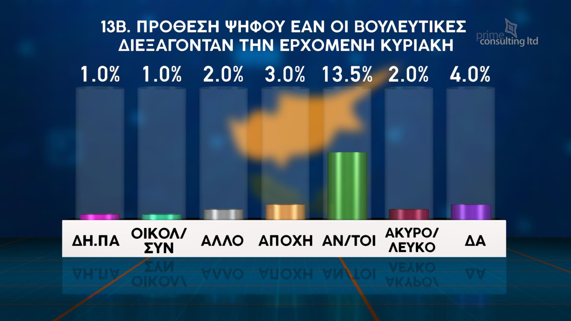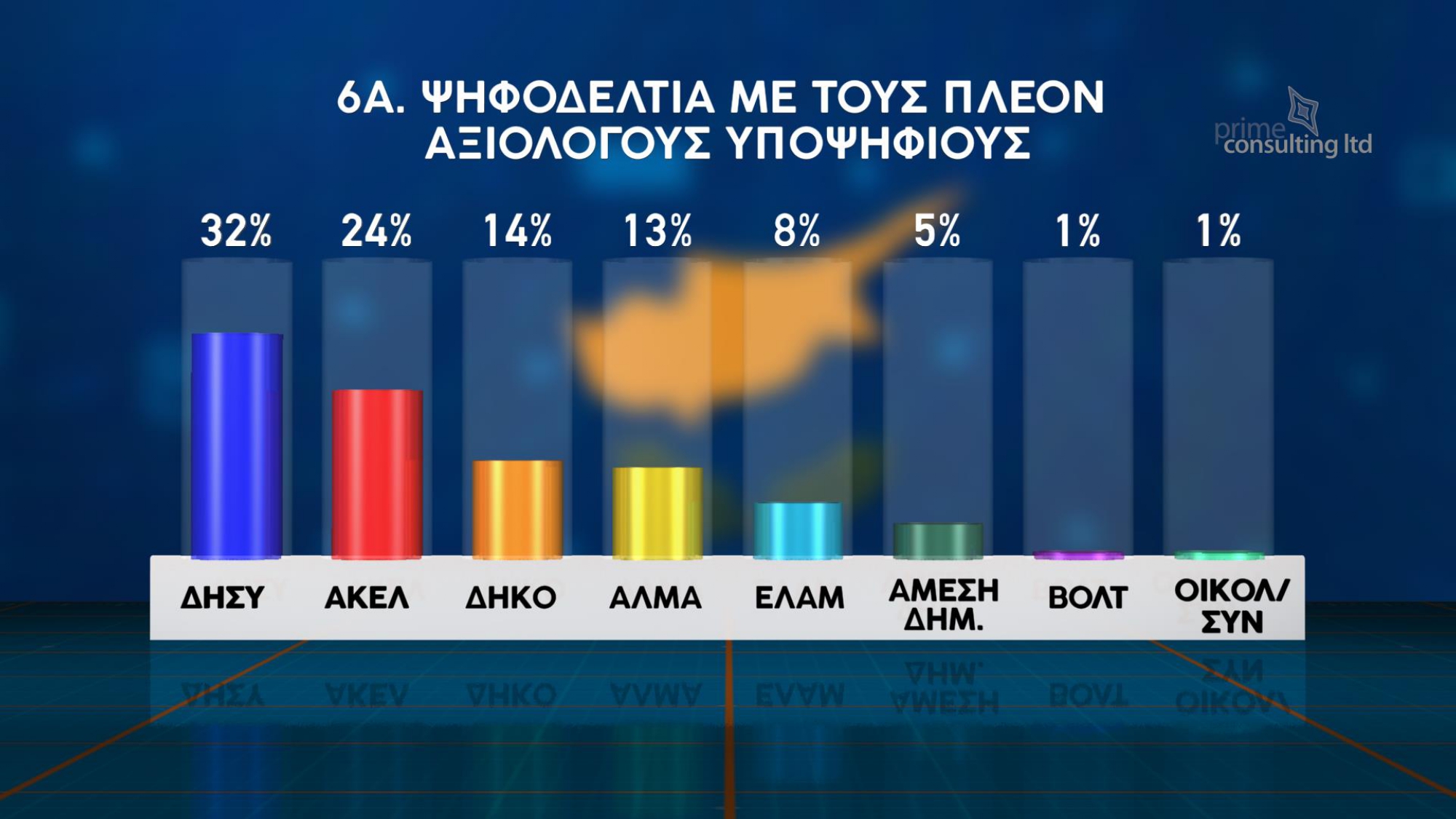 Άλλη μία δημοσκόπηση βγάζει ΔΗΣΥ και ΑΚΕΛ να ισοδυναμούν στην πρώτη θέση με 17.5%. Σύμφωνα με την πρόθεση ψήφου επτά κόμματα πιάνουν το όριο του 2,5% για είσοδο στη νέα Βουλή: ΔΗΣΥ, ΑΚΕΛ, ΕΛΑΜ, ΑΛΜΑ, ΔΗΚΟ, Άμεση Δημοκρατία, και VOLT με την ΕΔΕΚ να καραδοκεί και να διεκδικεί τη δική της είσοδο αφήνοντας ανοικτό και το ενδεχόμενο για οκτακομματική Βουλή.