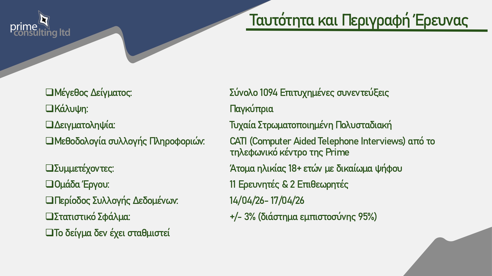 Στην έρευνα που διεξήχθη από 14-17/4/2026 συμμετείχαν 1094 άτομα από όλη την Κύπρο.