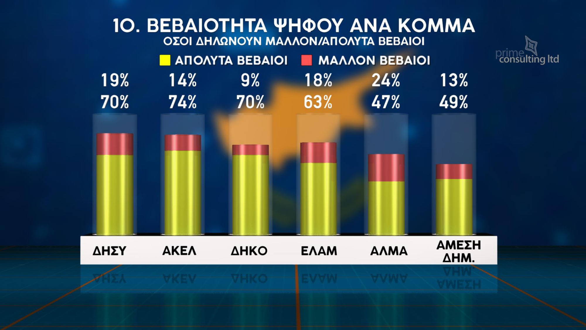 Τη μεγαλύτερη πάντως αύξηση στη βεβαιότητα ψήφου τους τελευταίους μήνες όσον αφορά τα κόμματα παρουσιάζει το ΔΗΚΟ που δείχνει μία ανανεωμένη δυναμική για το κόμμα του κέντρου.