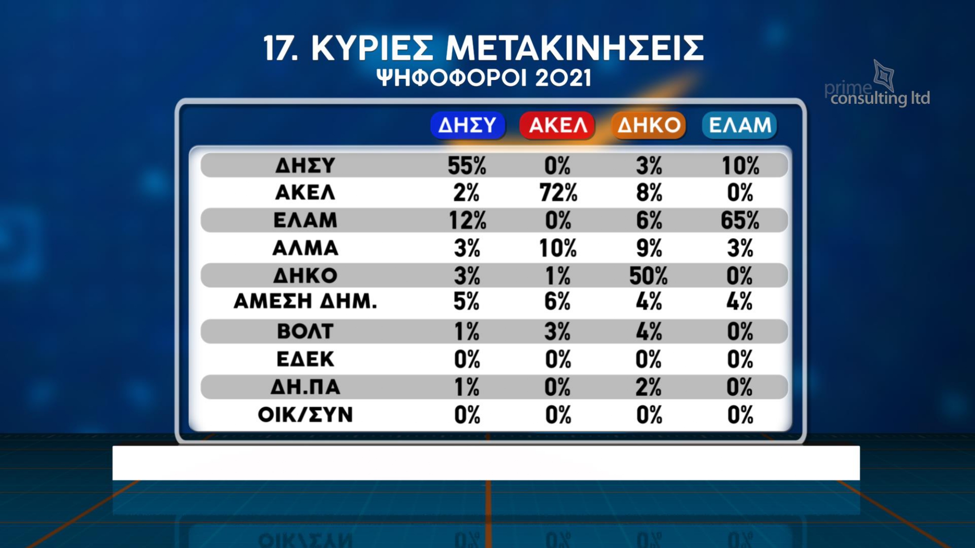 Όσον αφορά τις μετακινήσεις ψήφων με βάση το τι ψήφισαν το 2021, διαφαίνεται μια ροή ψηφοφόρων από ΔΗΣΥ σε ΕΛΑΜ αλλά και από ΕΛΑΜ σε ΔΗΣΥ. Το ΑΛΜΑ λαμβάνει ένα 10% από το ΑΚΕΛ ενώ η Άμεση Δημοκρατία «τραβάει» μικρά ποσοστά από όλα τα κόμματα.